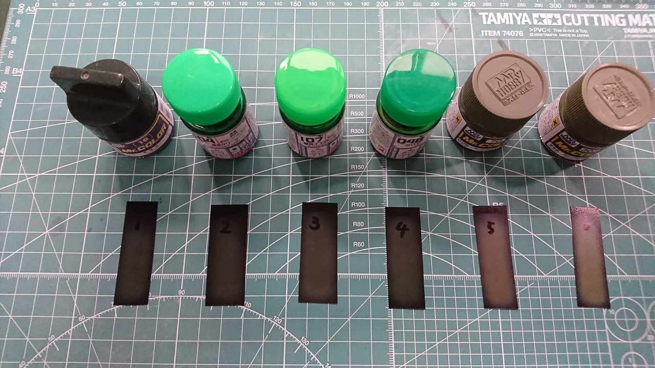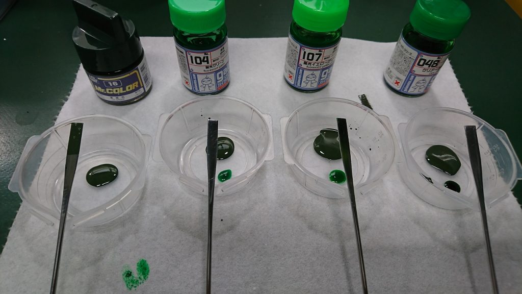 まずはベースとなる濃い緑色ですが,手持ちの塗料から以下を考えました.