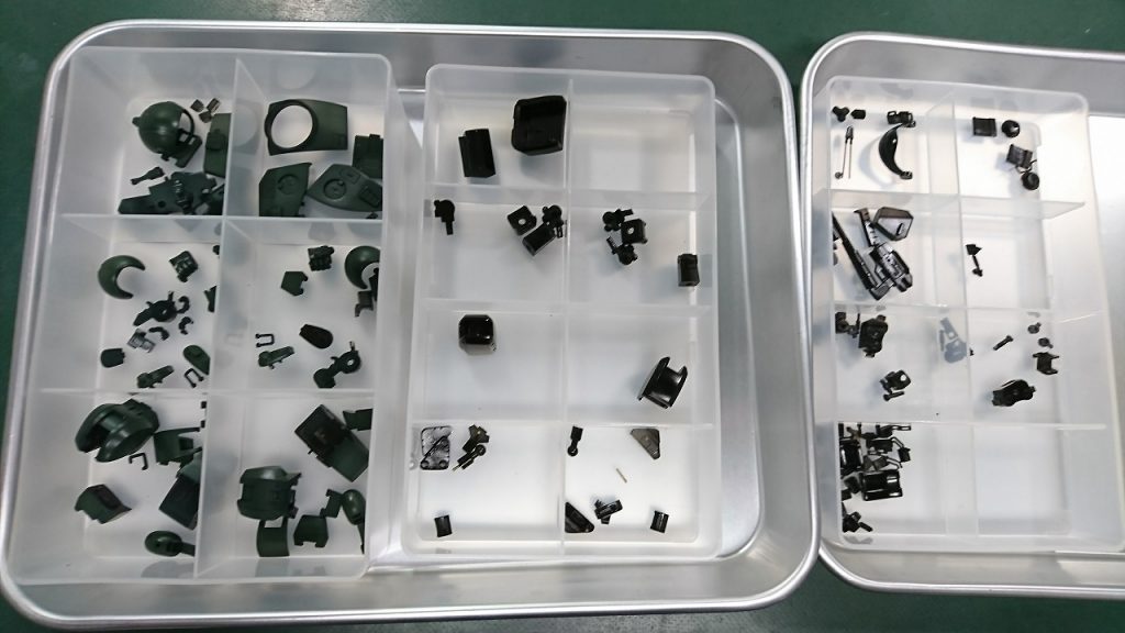 濃い緑色はなんとか噴き終わりました.一番左の箱が完了分です.