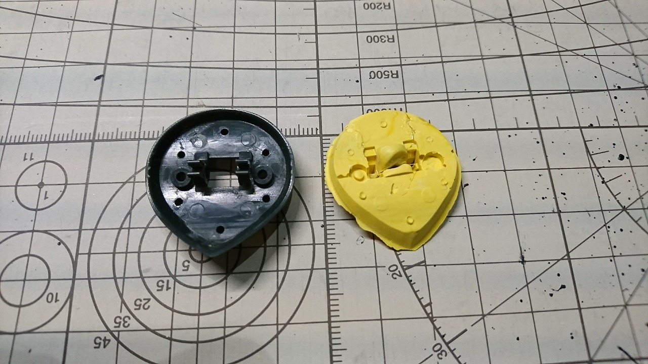 モノアイパーツの裏面にシリコンバリヤーを塗った後,ポリパテを塗って型を取りました.