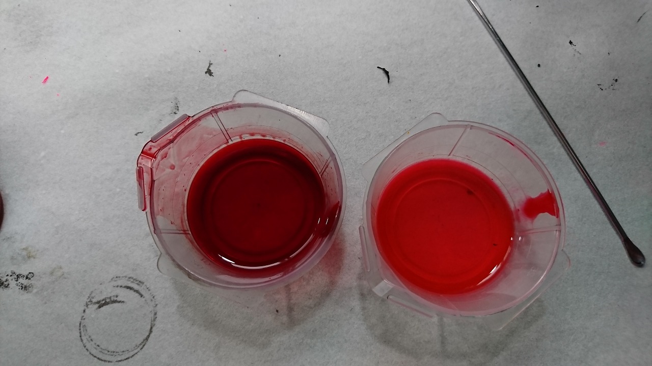 蛍光ピンクを入れて滲ませても赤がマダラ模様になりました.