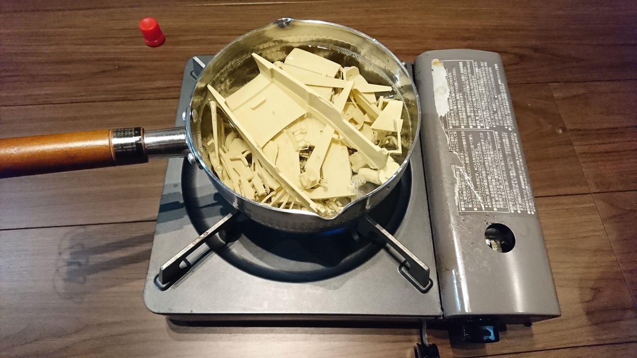 その間,先程煮立てたパーツ類は中性洗剤をつけた歯ブラシでこすって離型剤に