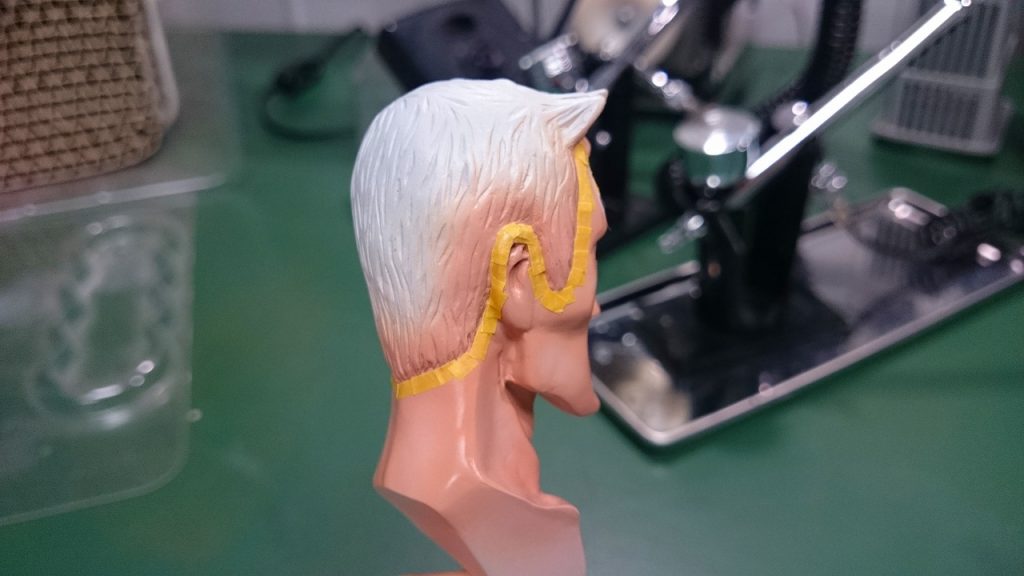 ついで髪の毛を塗りますので,生え際をマスキングします.