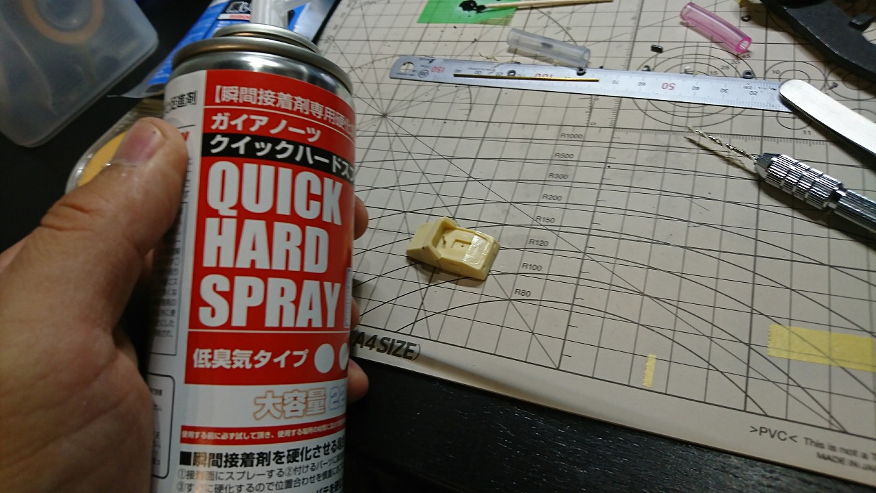 ここで相手側の真鍮線に瞬間接着剤の硬化剤を噴きつけます.瞬間接着剤側では